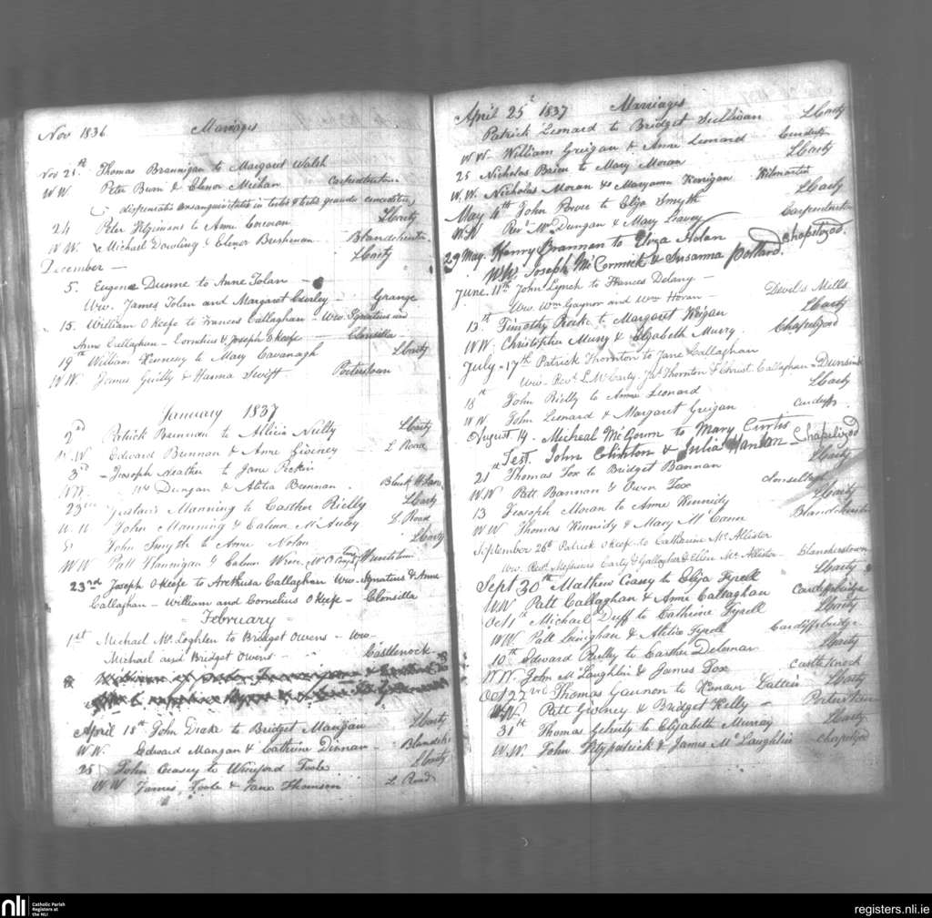Blanchardstown; County of Dublin; Archdiocese of Dublin. Marriages, Nov. 1836 to Oct. 1837