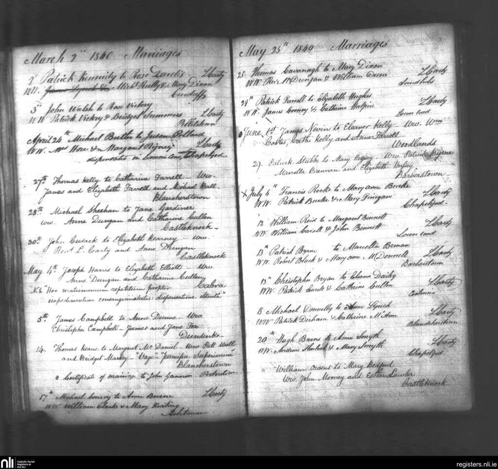 Blanchardstown; County of Dublin; Archdiocese of Dublin. Marriages, Mar. 1840 to July 1840