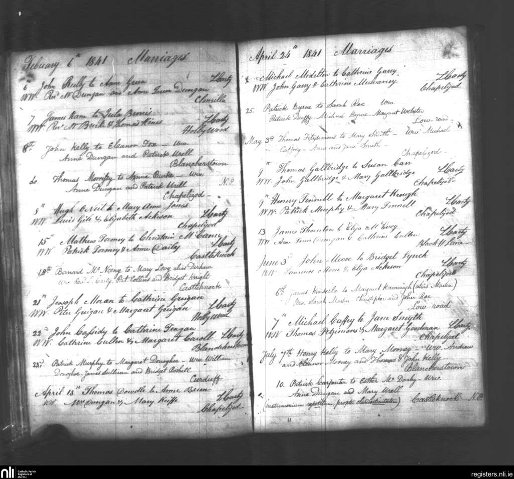 Blanchardstown; County of Dublin; Archdiocese of Dublin. Marriages, Feb. 1841 to July 1841