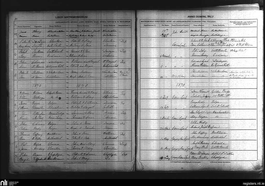 Blanchardstown; County of Dublin; Archdiocese of Dublin. Marriages, Aug. 1869 to May 1870