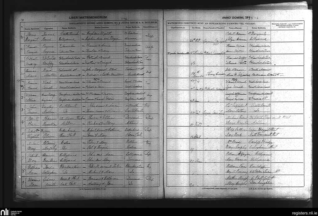 Blanchardstown; County of Dublin; Archdiocese of Dublin. Marriages, Oct. 1873 to June 1874