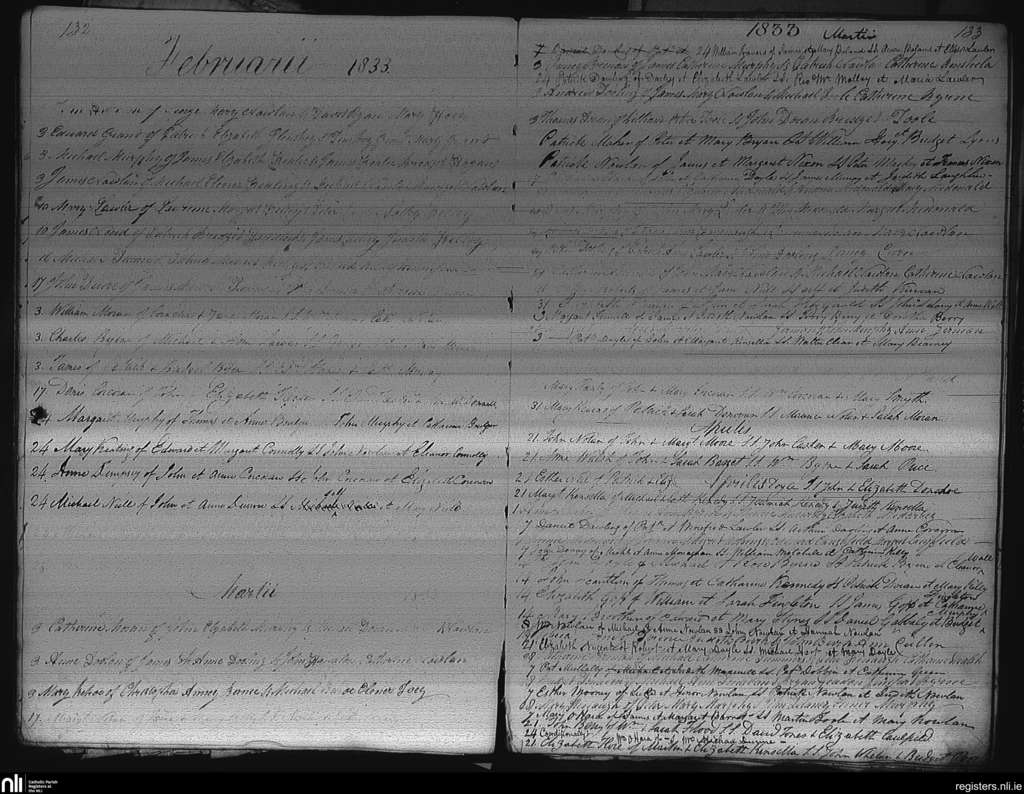Castledermot; County of Kildare; Archdiocese of Dublin. Baptisms, Feb. 1833 to Apr. 1833