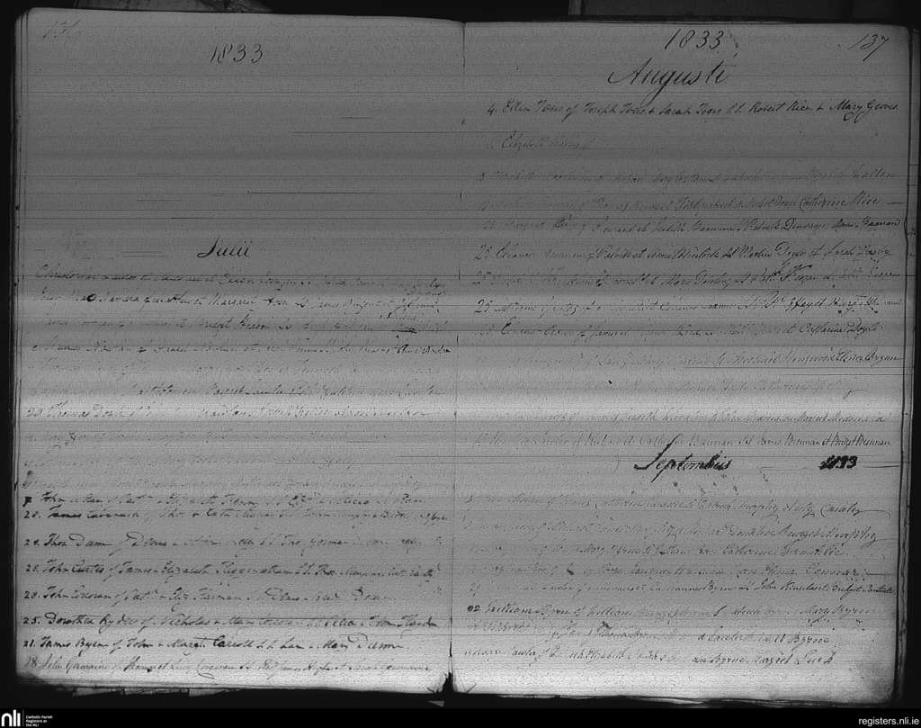 Castledermot; County of Kildare; Archdiocese of Dublin. Baptisms, July 1833 to Sep. 1833