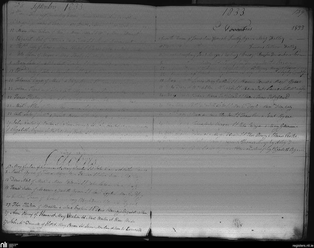 Castledermot; County of Kildare; Archdiocese of Dublin. Baptisms, Sep. 1833 to Nov. 1833