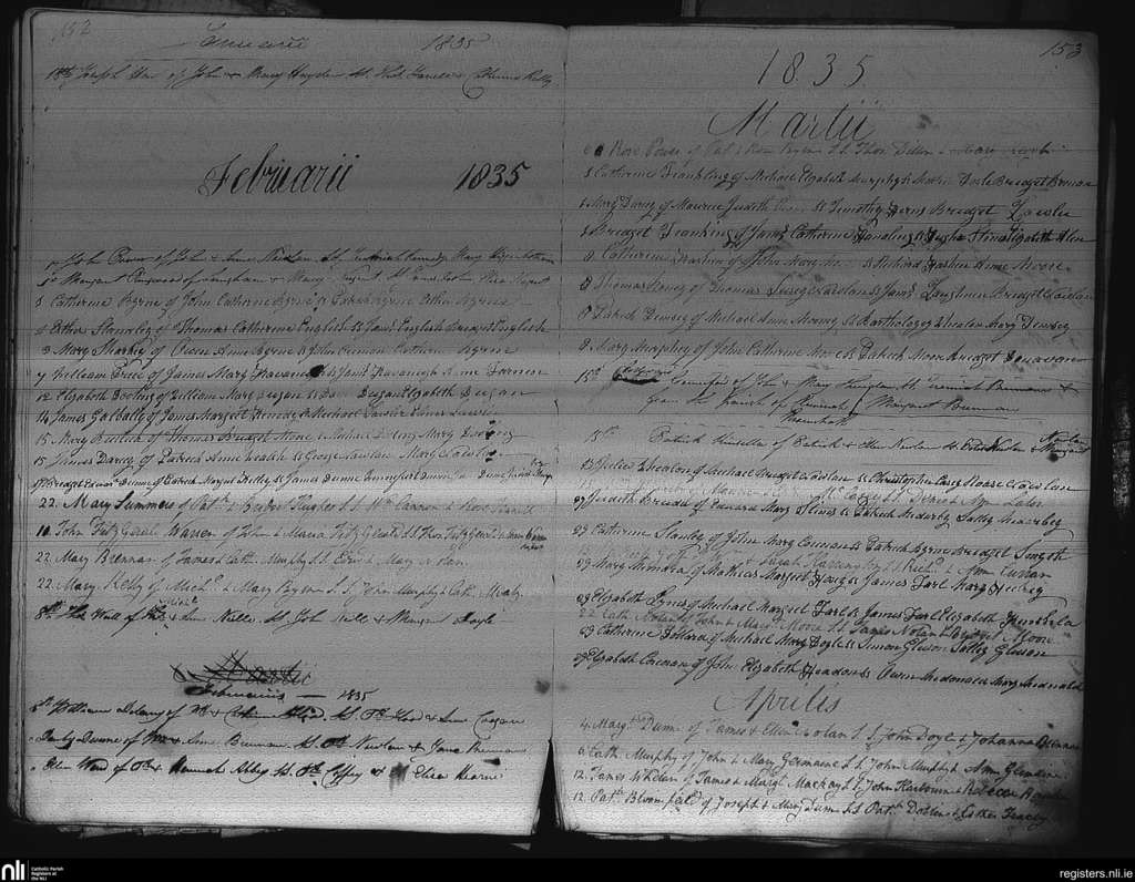 Castledermot; County of Kildare; Archdiocese of Dublin. Baptisms, Jan. 1835 to Apr. 1835