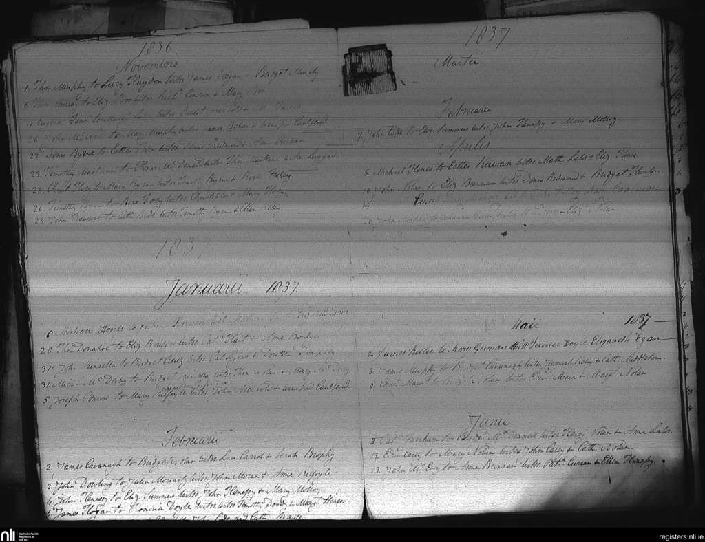 Castledermot; County of Kildare; Archdiocese of Dublin. Marriages, Nov. 1836 to June 1837