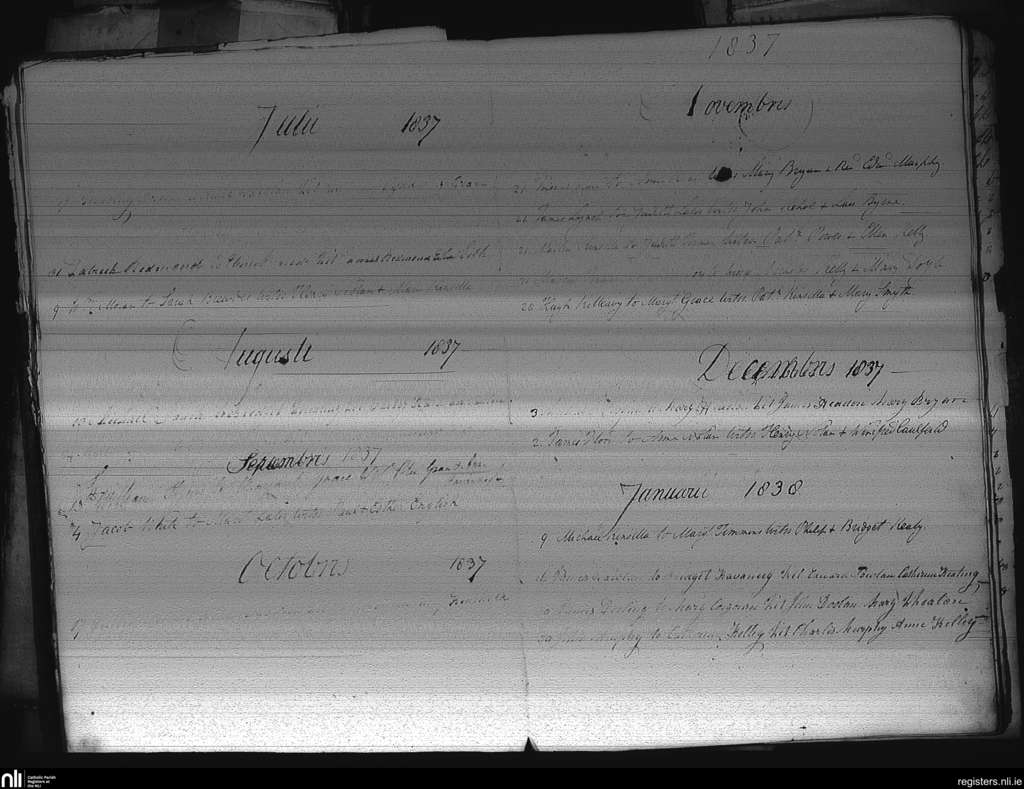 Castledermot; County of Kildare; Archdiocese of Dublin. Marriages, July 1837 to Jan. 1838