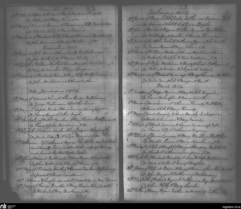 Narraghmore, Crookstown and Kilmeade; County of Kildare; Archdiocese of Dublin. Baptisms, Nov. 1853 to Mar. 1854