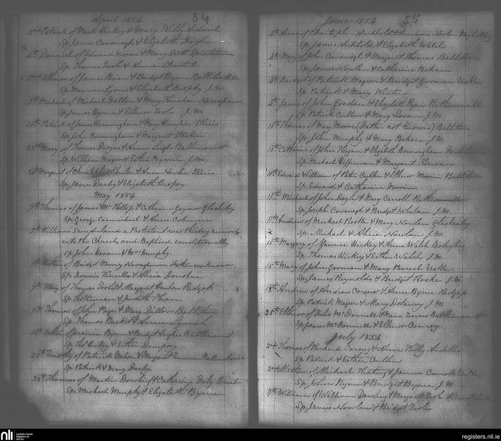 Narraghmore, Crookstown and Kilmeade; County of Kildare; Archdiocese of Dublin. Baptisms, Apr. 1854 to July 1854