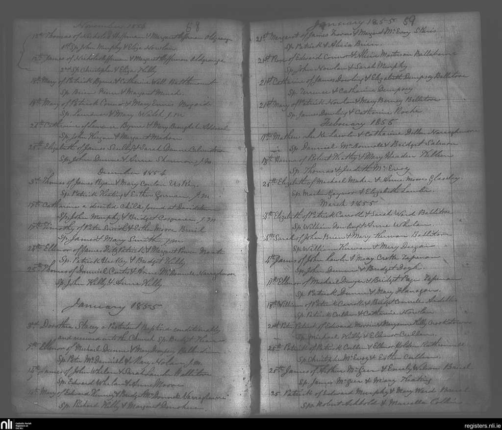 Narraghmore, Crookstown and Kilmeade; County of Kildare; Archdiocese of Dublin. Baptisms, Nov. 1854 to Mar. 1855
