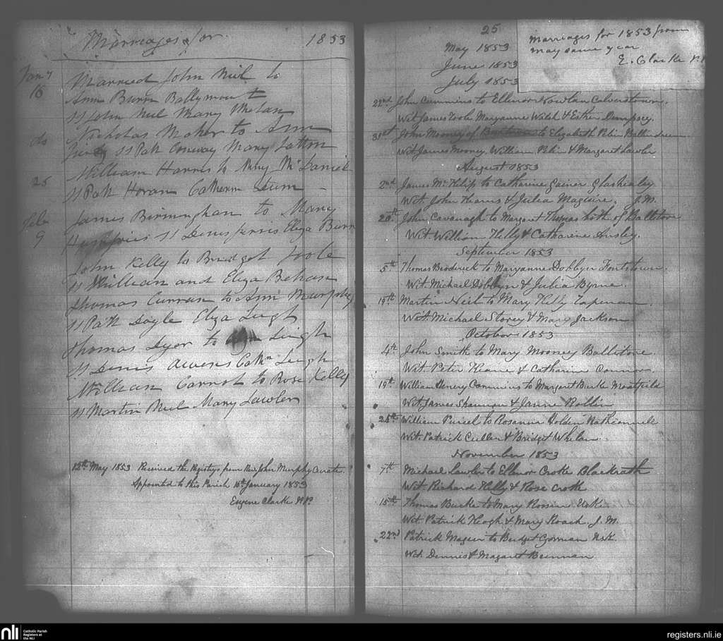 Narraghmore, Crookstown and Kilmeade; County of Kildare; Archdiocese of Dublin. Marriages, Jan. 1853 to Nov. 1853