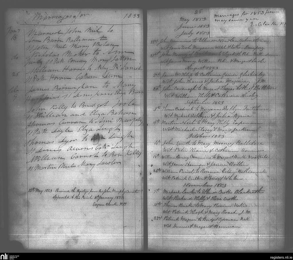 Narraghmore, Crookstown and Kilmeade; County of Kildare; Archdiocese of Dublin. Marriages, Jan. 1853 to Nov. 1853