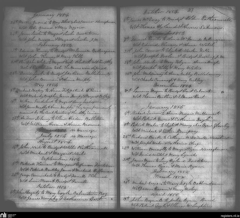 Narraghmore, Crookstown and Kilmeade; County of Kildare; Archdiocese of Dublin. Marriages, Jan. 1854 to Apr. 1855