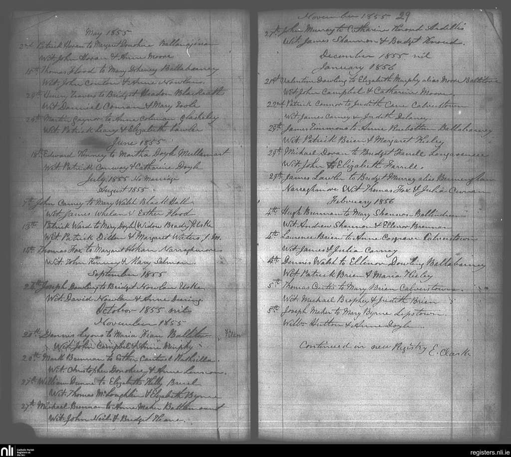 Narraghmore, Crookstown and Kilmeade; County of Kildare; Archdiocese of Dublin. Marriages, May 1855 to Feb. 1856
