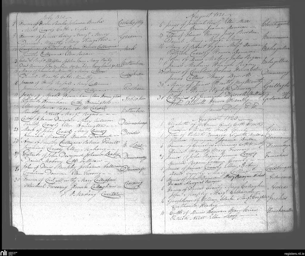 Dunmanway; County of Cork; Diocese of Cork and Ross. Baptisms, July 1820 to Aug. 1820