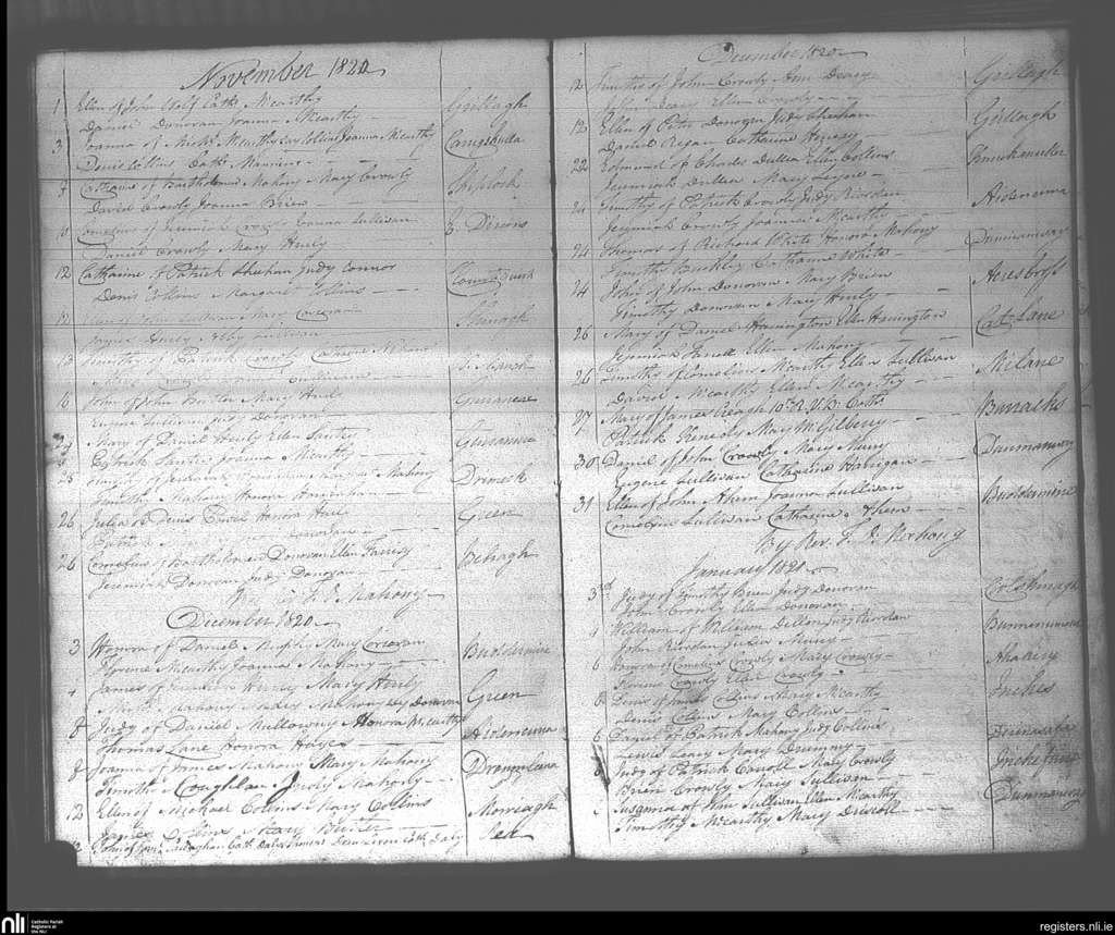 Dunmanway; County of Cork; Diocese of Cork and Ross. Baptisms, Nov. 1820 to Jan. 1821