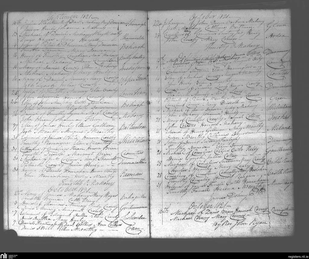 Dunmanway; County of Cork; Diocese of Cork and Ross. Baptisms, Sep. 1821 to Oct. 1821
