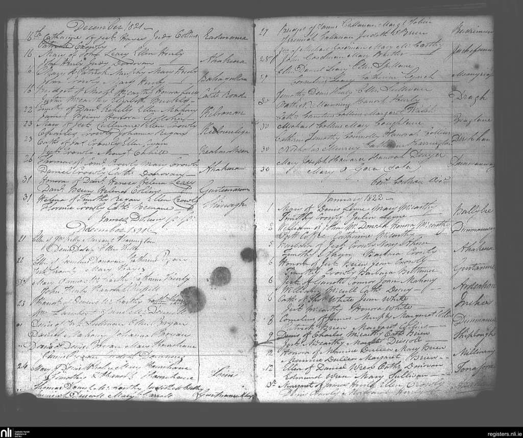Dunmanway; County of Cork; Diocese of Cork and Ross. Baptisms, Dec. 1821 to Jan. 1822