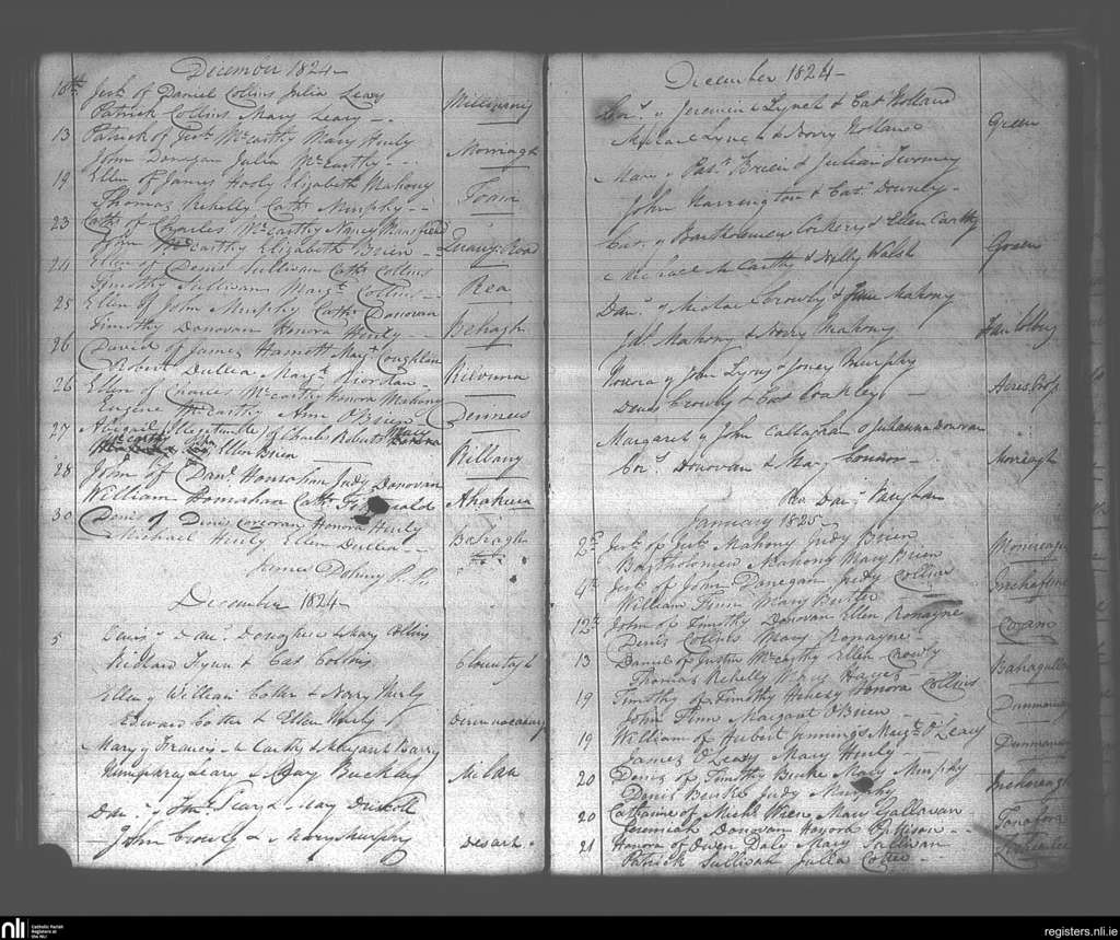 Dunmanway; County of Cork; Diocese of Cork and Ross. Baptisms, Dec. 1824 to Jan. 1825