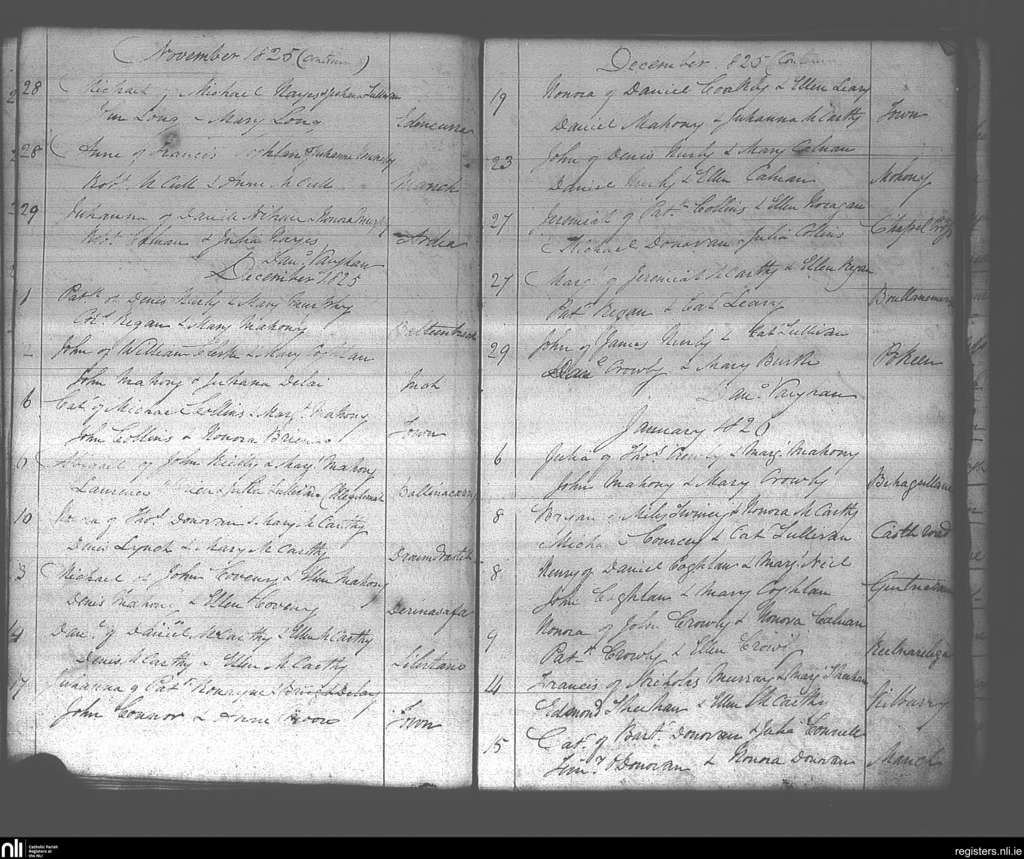 Dunmanway; County of Cork; Diocese of Cork and Ross. Baptisms, Nov. 1825 to Jan. 1826