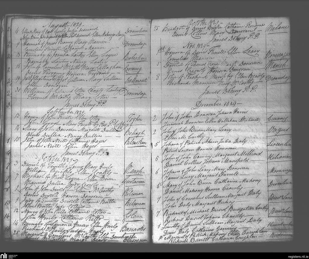 Dunmanway; County of Cork; Diocese of Cork and Ross. Baptisms, Aug. 1829 to Dec. 1829