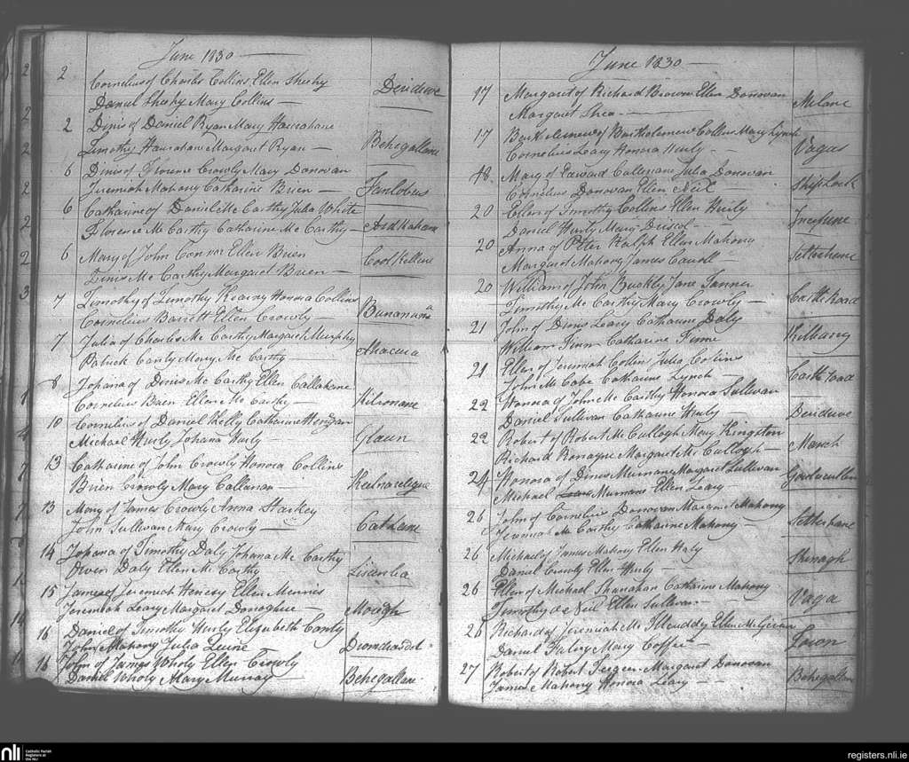 Dunmanway; County of Cork; Diocese of Cork and Ross. Baptisms, June 1830