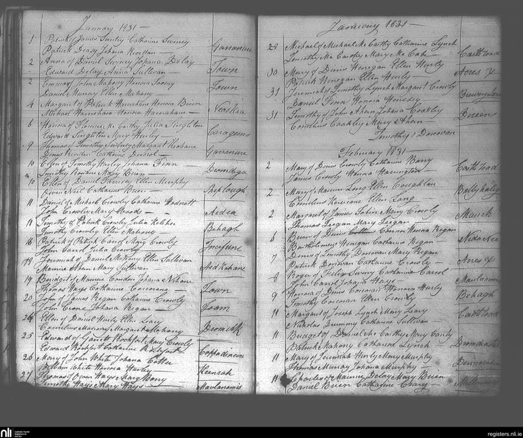 Dunmanway; County of Cork; Diocese of Cork and Ross. Baptisms, Jan. 1831 to Feb. 1831