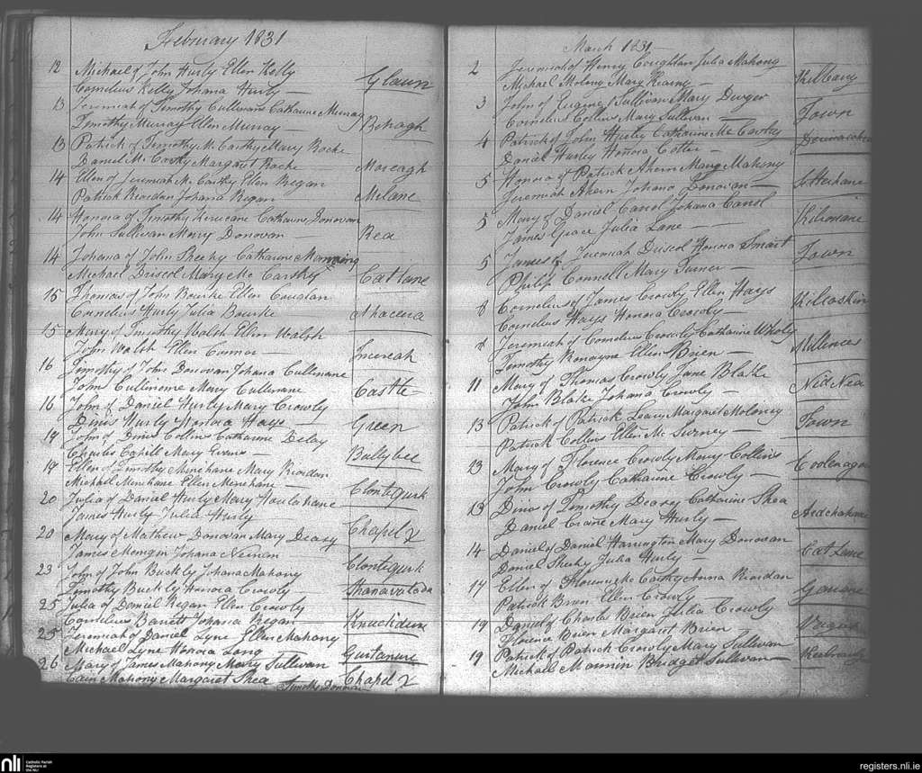 Dunmanway; County of Cork; Diocese of Cork and Ross. Baptisms, Feb. 1831 to Mar. 1831