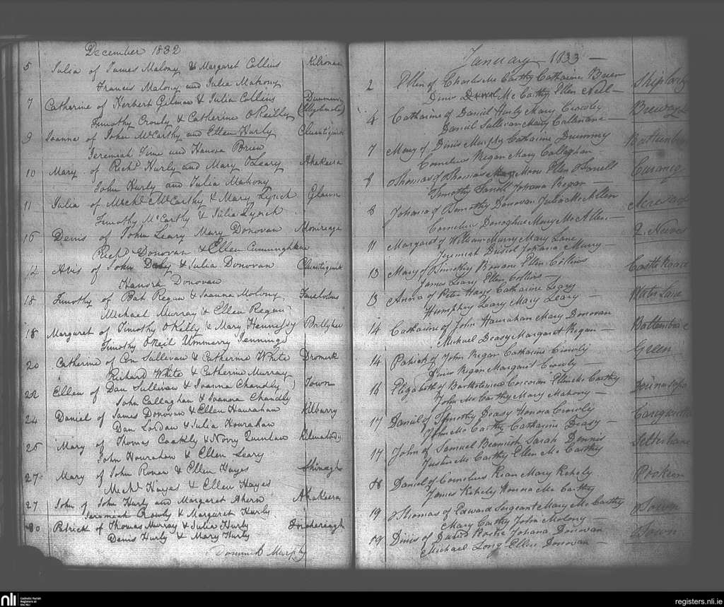 Dunmanway; County of Cork; Diocese of Cork and Ross. Baptisms, Dec. 1832 to Jan. 1833