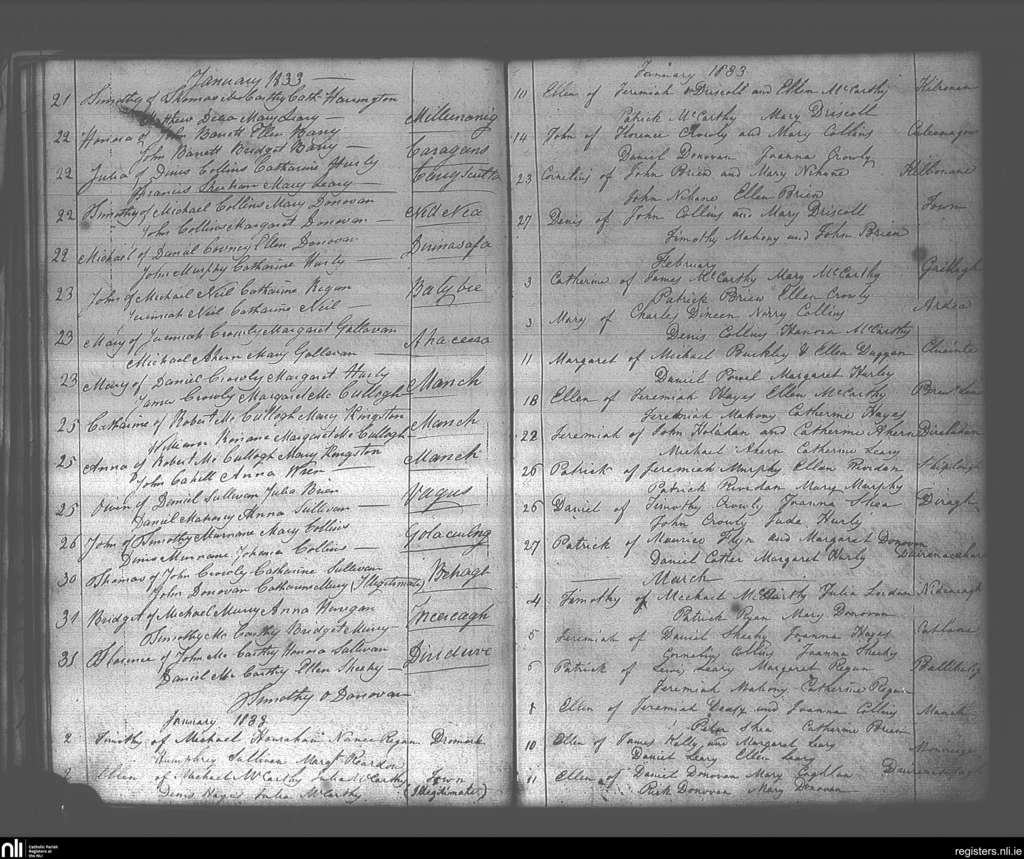 Dunmanway; County of Cork; Diocese of Cork and Ross. Baptisms, Jan. 1833 to Mar. 1833