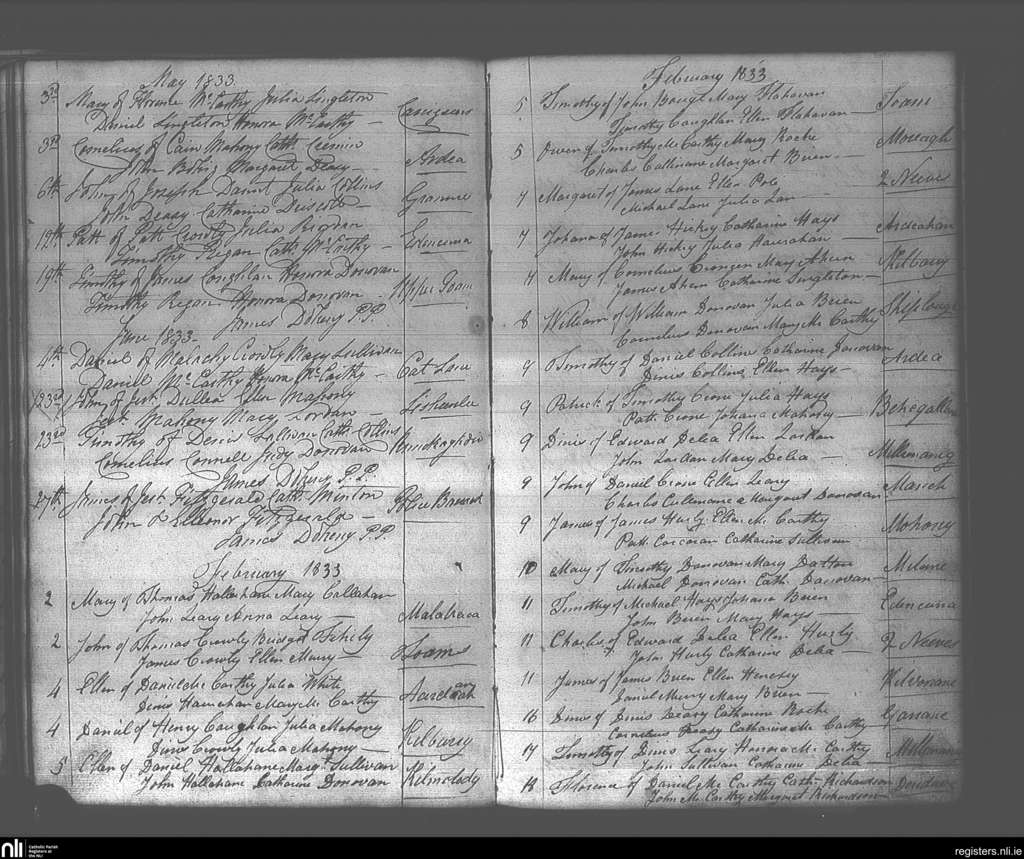 Dunmanway; County of Cork; Diocese of Cork and Ross. Baptisms, Feb. 1833 to June 1833