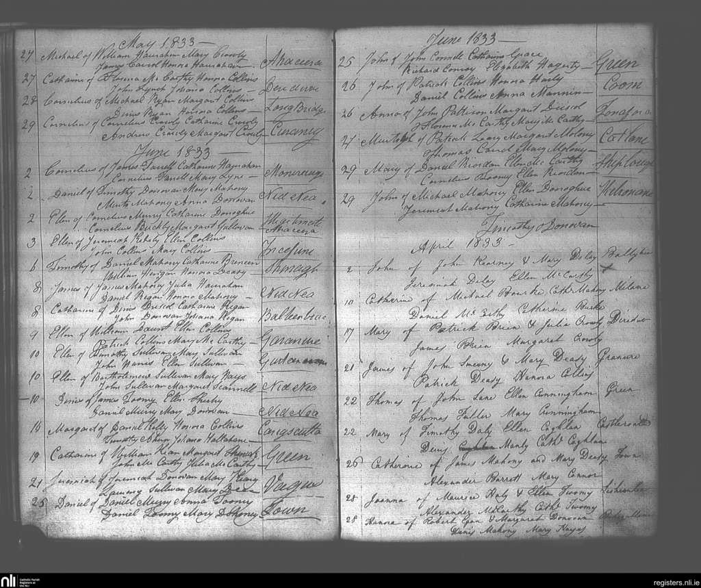 Dunmanway; County of Cork; Diocese of Cork and Ross. Baptisms, Apr. 1833 to June 1833
