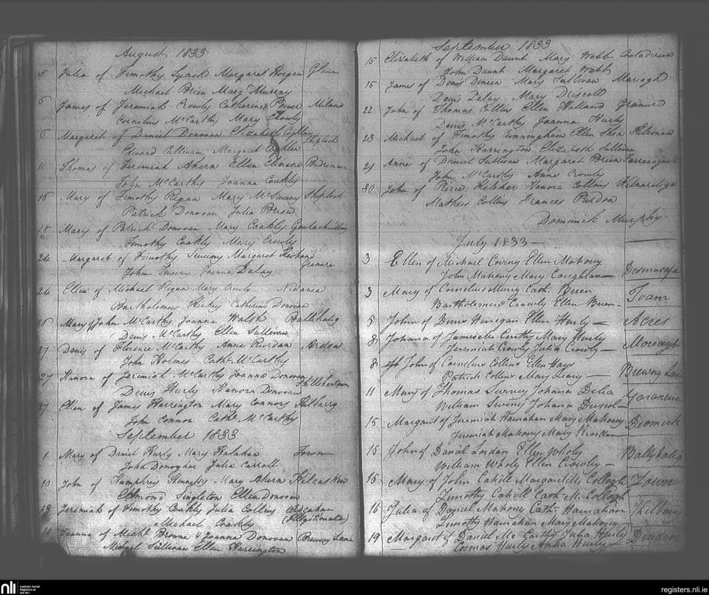 Dunmanway; County of Cork; Diocese of Cork and Ross. Baptisms, July 1833 to Sep. 1833
