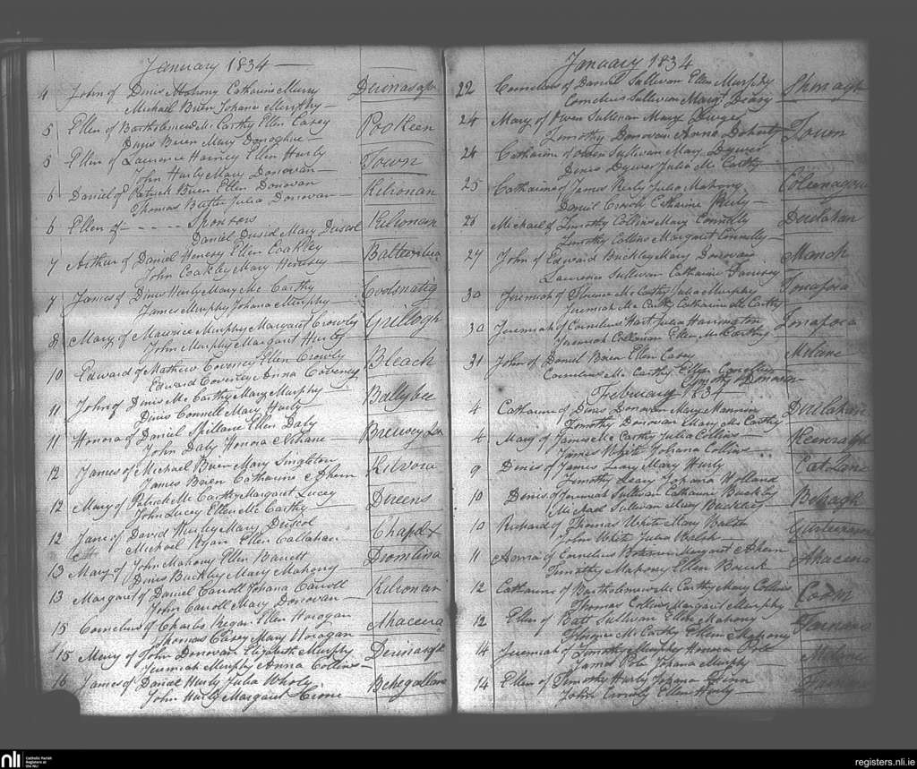 Dunmanway; County of Cork; Diocese of Cork and Ross. Baptisms, Jan. 1834 to Feb. 1834