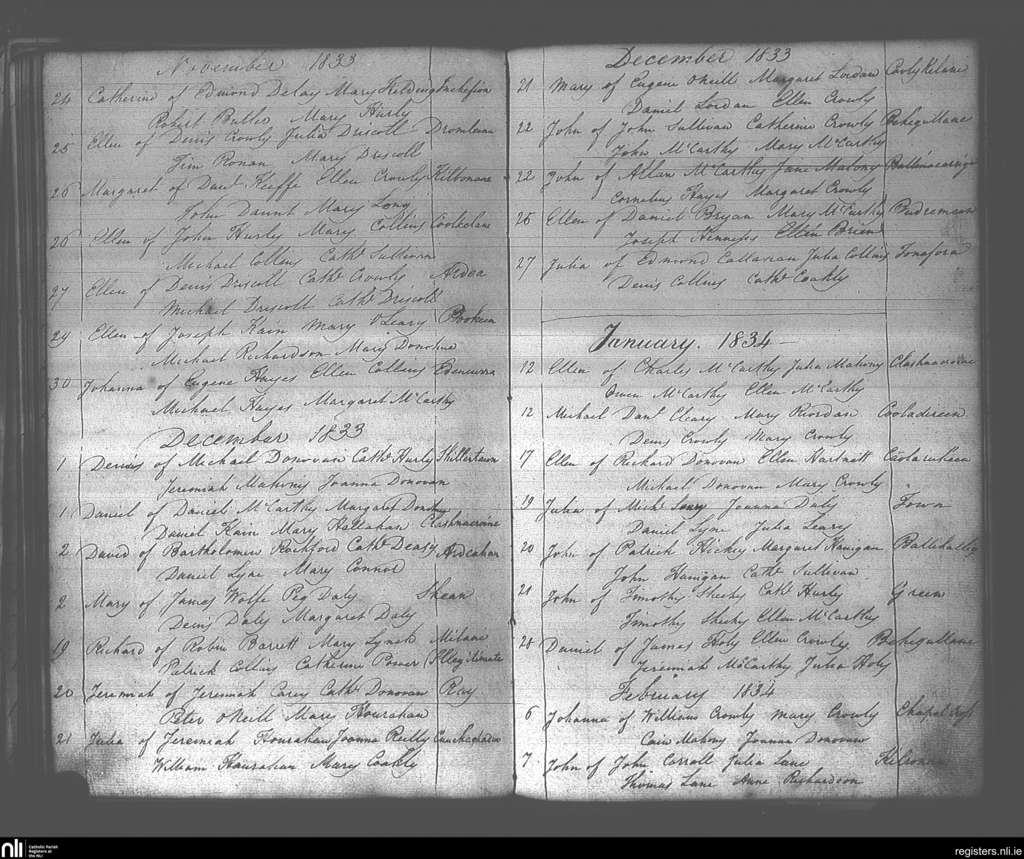 Dunmanway; County of Cork; Diocese of Cork and Ross. Baptisms, Nov. 1833 to Feb. 1834