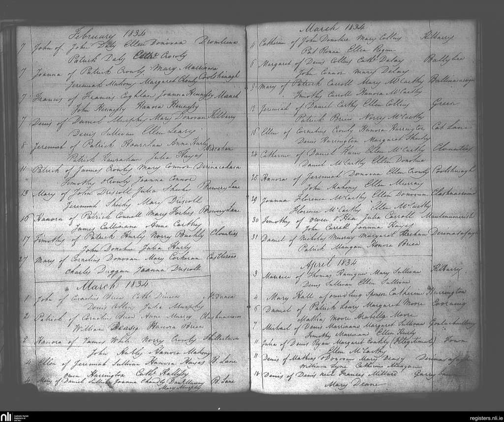 Dunmanway; County of Cork; Diocese of Cork and Ross. Baptisms, Feb. 1834 to Apr. 1834