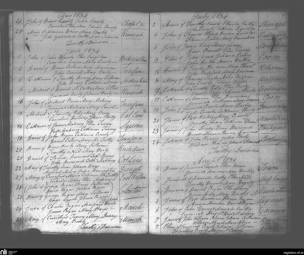 Dunmanway; County of Cork; Diocese of Cork and Ross. Baptisms, May 1834 to Aug. 1834