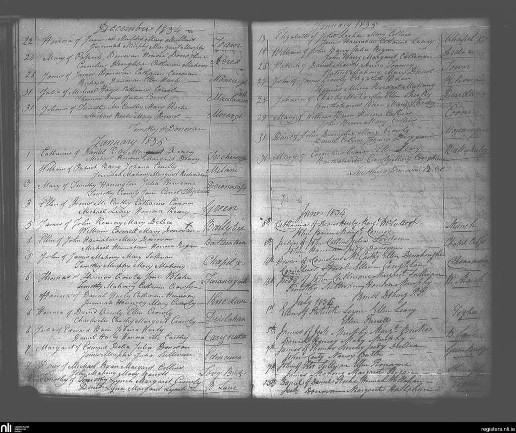 Dunmanway; County of Cork; Diocese of Cork and Ross. Baptisms, June 1834 to Jan. 1835