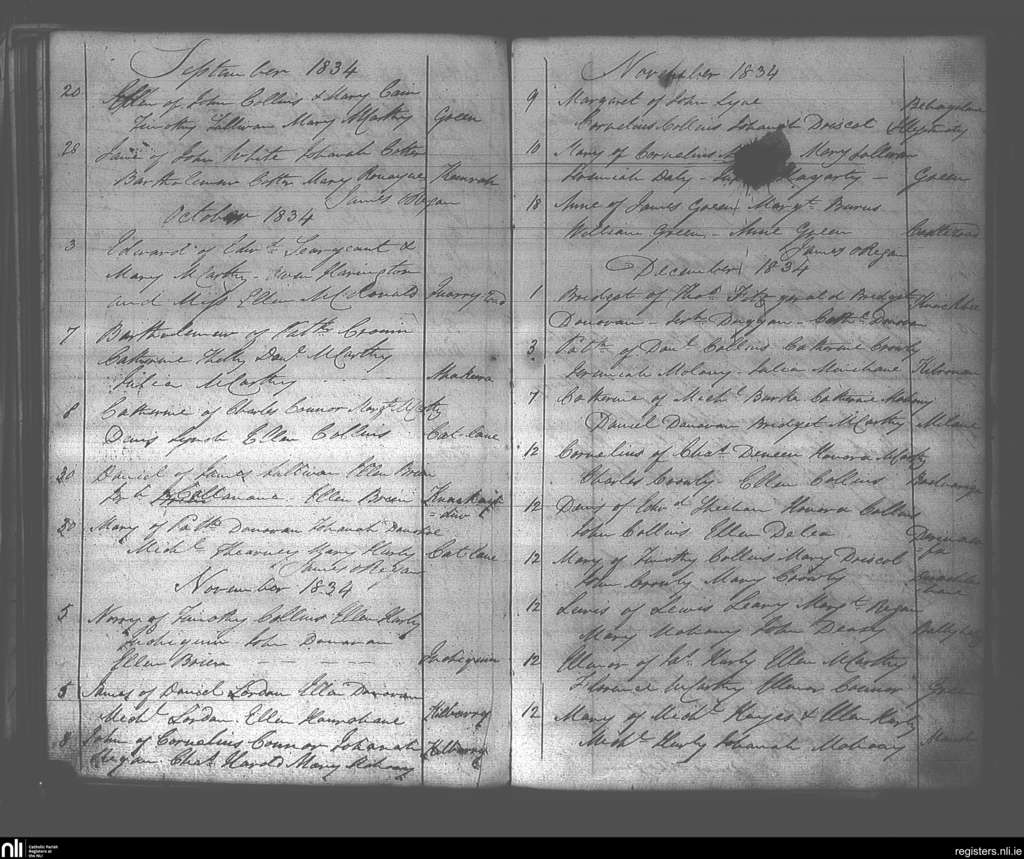 Dunmanway; County of Cork; Diocese of Cork and Ross. Baptisms, Sep. 1834 to Dec. 1834