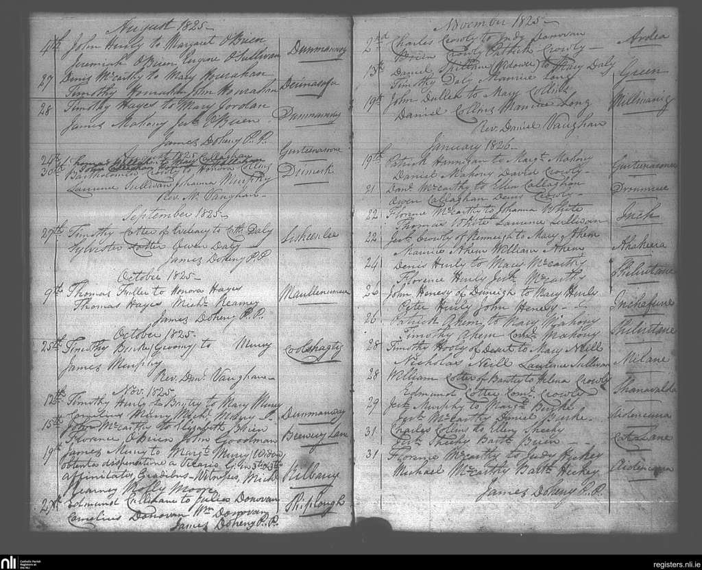Dunmanway; County of Cork; Diocese of Cork and Ross. Marriages, Aug. 1825 to Jan. 1826
