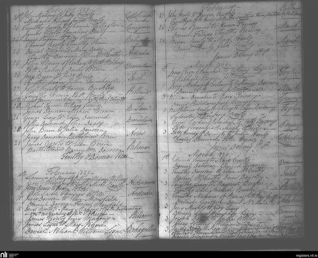 Dunmanway; County of Cork; Diocese of Cork and Ross. Marriages, Feb. 1829 to Mar. 1829