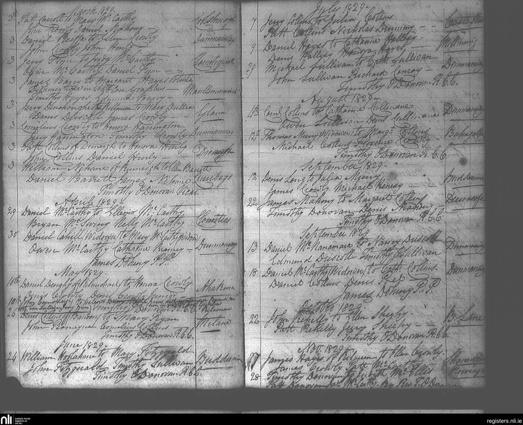 Dunmanway; County of Cork; Diocese of Cork and Ross. Marriages, Mar. 1829 to Nov. 1829