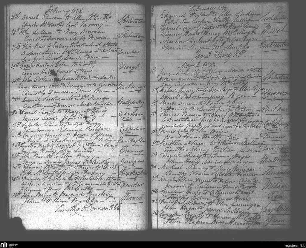 Dunmanway; County of Cork; Diocese of Cork and Ross. Marriages, Feb. 1832 to Mar. 1832