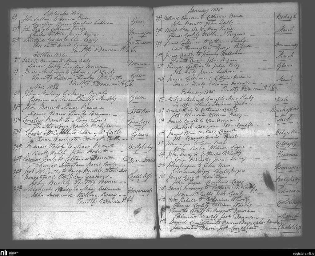 Dunmanway; County of Cork; Diocese of Cork and Ross. Marriages, Sep. 1834 to Feb. 1835