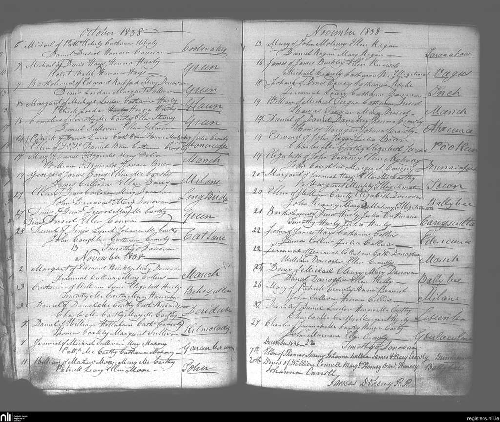 Dunmanway; County of Cork; Diocese of Cork and Ross. Baptisms, Oct. 1838 to Dec. 1838