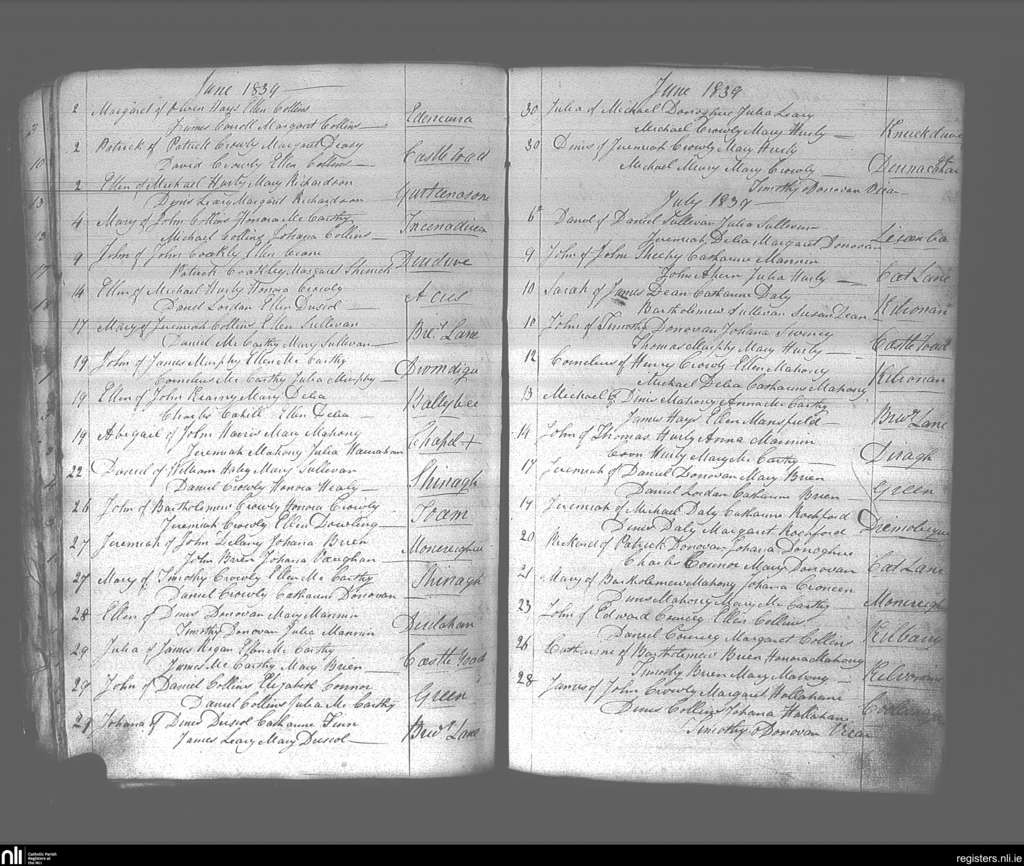 Dunmanway; County of Cork; Diocese of Cork and Ross. Baptisms, June 1839 to July 1839