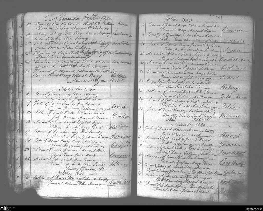 Dunmanway; County of Cork; Diocese of Cork and Ross. Baptisms, Sep. 1840 to Nov. 1840