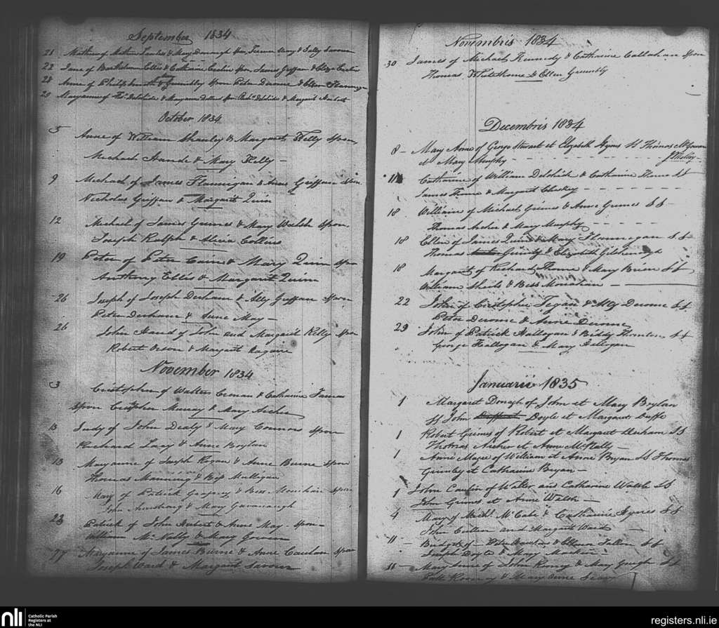 Skerries; County of Dublin; Archdiocese of Dublin. Baptisms, Sep. 1834 to Jan. 1835