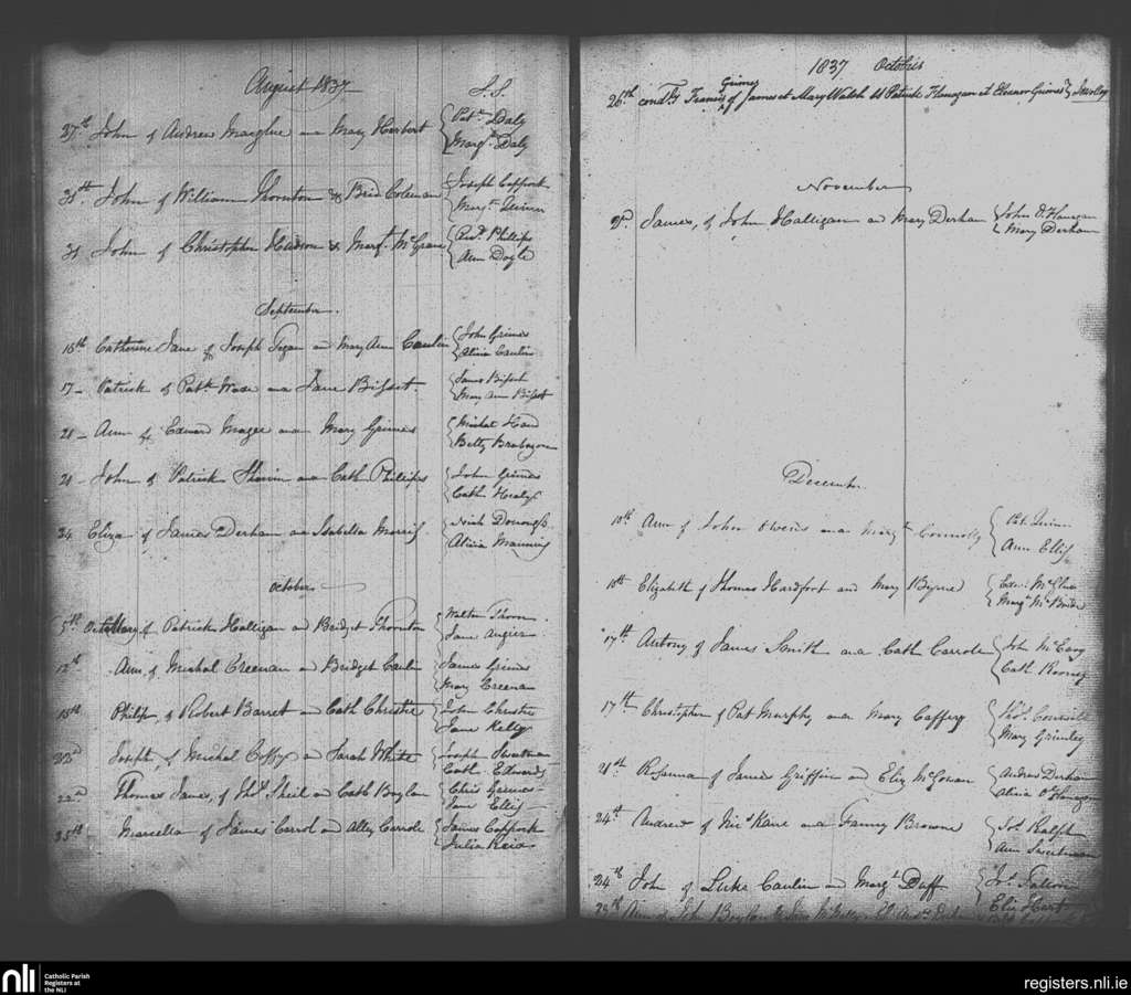 Skerries; County of Dublin; Archdiocese of Dublin. Baptisms, Aug. 1837 to Dec. 1837