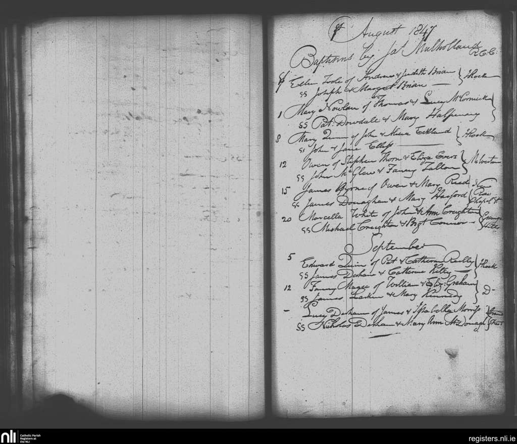 Skerries; County of Dublin; Archdiocese of Dublin. Baptisms, Aug. 1847 to Sep. 1847